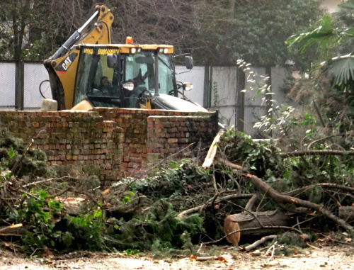 "Рождественский праздник был испорчен. Куда мы только ни звонили: в полицию, главе города, депутатам, в МЧС, чтобы спасти взрослые магнолии, кипарисы, платаны и другие зеленые насаждения, которые росли на территории детского центра. Но, как понимаете, никто из них не был доступен, никто не приехал", - рассказала корреспонденту Следы вырубки деревьев на территории детского центра на улице Красноармейская. Сочи, 7 января 2012 г. Фото Светланы Кравченко для "Кавказского узла""Кавказского узла" жительница одного из домов на улице Гагарина города Сочи Людмила Алешина.