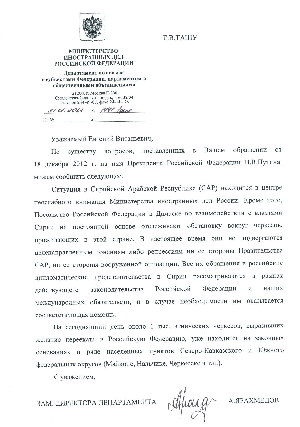 Ответ МИД РФ на обращение Совета Черкесских общественных организаций России Президенту РФ В. Путину