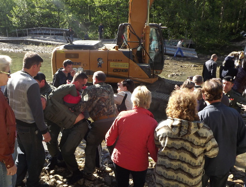 Местная активистка Татьяна Осипова говорит, что избиение Ирины произошло после того, как она подошла совсем близко к реке, где велись работы. "Людей на месте событий порядка 70 человек, сотрудников полиции - несколько больше, и они все время прибывают. Людей оттеснили к берегу, мост продолжают восстанавливать", - рассказала она.