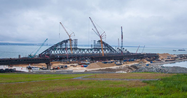 Сборка железнодорожной судоходной арки моста через Керченский пролив полностью завершена, готовится ее установка на опоры. Автомобильная арка готова на 80%, сообщил инфоцентр "Крымский мост".