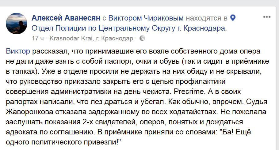 В ходе задержания сотрудники полиции не дали Виктору Чирикову взять с собой паспорт, очки и обувь. А во время рассмотрения дела суд отказался заслушать показания свидетелей, а также отказался дождаться адвоката по соглашению, рассказал в социальной сети Facebook краснодарский адвокат Алексей Аванесян.