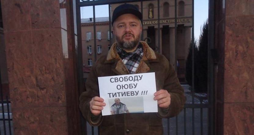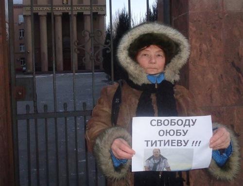 Флешмоб в поддержку правозащитника прошел у здания областного суда в рамках традиционной "прогулки оппозиции". Активисты по очереди фотографировались с плакатом "Свободу Оюбу Титиеву!". Охранник областного суда попросил активистов не фотографироваться на территории суда и выйти за забор. Активисты сфотографировались у ворот облсуда.
