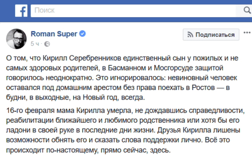 По словам знакомых режиссера, Серебренникову не позволили съездить в Ростов-на-Дону и увидеться с матерью, хотя его защита неоднократно просила разрешить ему поездку. Кирилл Серебренников был единственным сыном у своих родителей и был очень привязан к матери, написал сегодня журналист Роман Супер на своей странице в Facebook. Он отметил, что мать режиссера умерла 16 февраля.