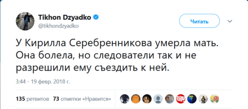 "У Кирилла Серебренникова умерла мать. Она болела, но следователи так и не разрешили ему съездить к ней", - написал сегодня журналист Тихон Дзядко в своем Twitter.
