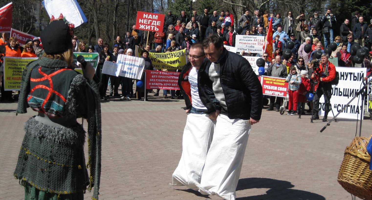 С участием митингующих ведущие в костюмах скоморохов провели шуточные конкурсы: бег в мешках, перетягивание каната, поедание "чиновничьей лапши" и бросание символических отписок чиновников в корзину. Эти конкурсы, как пояснили участники акции, организованы "по аналогии с действиями чиновников". В конце мероприятия состоялся розыгрыш лотереи, "суперприз" - палатку для бездомных - выиграла дольщица ЖК "Мезенский".