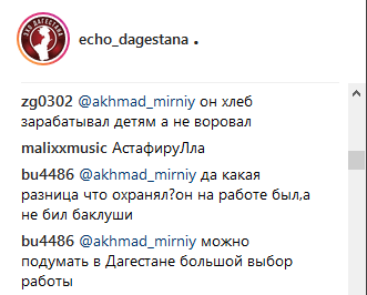"Да какая разница что охранял? Он на работе был, а не бил баклуши. Можно подумать в Дагестане большой выбор работы", - написал пользователь под ником bu4486.