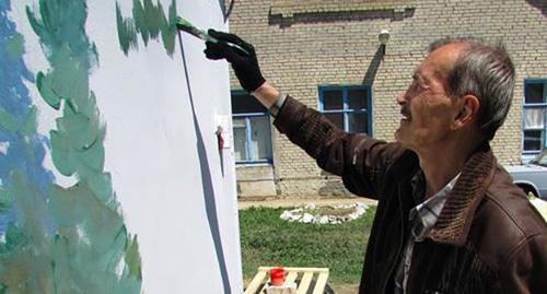 Постоялец гостиницы Геннадий Кулагин принял активное участие в акции. На двери гаража он рисовал красками лесной пейзаж. У Геннадия скромный опыт бездомной жизни на улице – всего две недели.