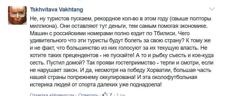 "Не, ну туристов пускаем... Они оставляют тут деньги, тем самым помогая экономике. Машин с российскими номерами полно ездит по Тбилиси. Что удивительного, что эти туристы будут болеть за свою страну? К тому же и не факт, что большинство из них голосуют за их текущую власть. Не хотите таких прецедентов - не пускайте! (...) Пустил домой? Так прояви гостеприимство - терпи и смотри, если не нарушает закон" - отметил Tskhvitava Vakhtang.