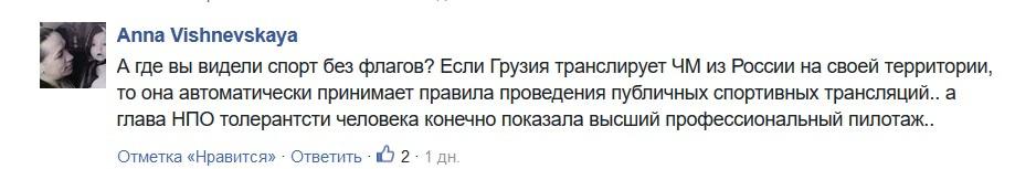 "А где вы видели спорт без флагов? Если Грузия транслирует ЧМ из России на своей территории, то она автоматически принимает правила проведения публичных спортивных трансляций... А глава НПО толерантности, конечно, показала высший профессиональный пилотаж..." - иронизирует в комментариях на сайте "Новости-Грузия" Anna Vishnevskaya.
