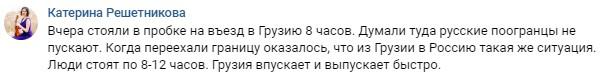 "Вчера стояли в пробке на въезд в Грузию 8 часов. Думали туда русские погранцы не пускают. Когда переехали границу, оказалось, что из Грузии в Россию такая же ситуация. Люди стоят по 8-12 часов. Грузия впускает и выпускает быстро", - сообщила Катерина Решетникова.