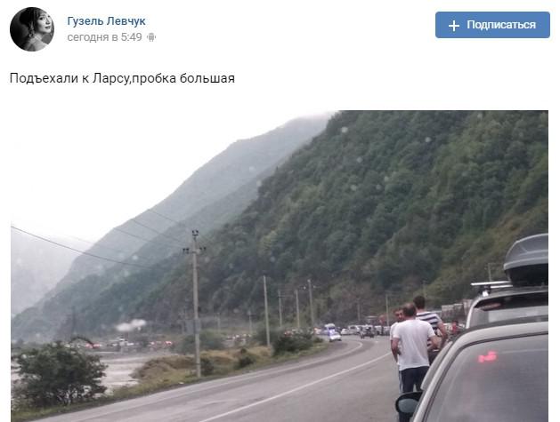 "Подъехали к Ларсу, пробка большая", - написала сегодня в 5.49 мск Гузель Левчук в группе "Ситуация на КПП "Верхний Ларс" (Крестовый перевал)" в социальной сети "ВКонтакте" и разместила фотографию очереди из машин.