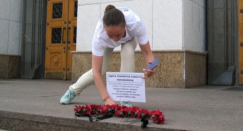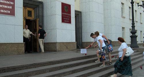 Сегодня обманутые дольщики пришли к зданию правительства и законодательного собрания Ростовской области с табличкой "Здесь покоится совесть чиновников". Они установили табличку на крыльце и возложили букеты цветов с траурными лентами. После этого из здания вышел человек и, не представившись, попытался убрать табличку, угрожая вызовом полиции и заявив, что "любые акции запрещены", передает корреспондент "Кавказского узла".