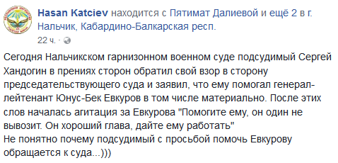 На эту реплику Хандогина отреагировал бывший сотрудник УБЭП в Ингушетии Хасан Кациев, уволенный из полиции в феврале 2014 года и затем заявивший, что подвергся пыткам со стороны силовиков. "Подсудимый Сергей Хандогин в прениях сторон обратил свой взор в сторону председательствующего суда и заявил, что ему помогал... Юнус-Бек Евкуров, в том числе материально. После этих слов началась агитация за Евкурова "Помогите ему, он один не вывозит. Он хороший глава, дайте ему работать". Не понятно, почему подсудимый с просьбой помочь Евкурову обращается к суду...", - написал 18 июля Хасан Кациев на своей странице в Facebook.