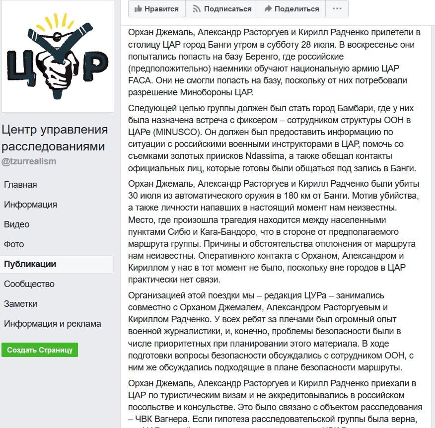 Орхан Джемаль, Александр Расторгуев и Кирилл Радченко "не смогли попасть на (военную) базу, поскольку от них потребовали разрешение минобороны ЦАР. Следующей целью группы должен был стать город Бамбари, где у них была назначена встреча с фиксером – сотрудником структуры ООН в ЦАР. Он должен был предоставить информацию по ситуации с российскими военными инструкторами в ЦАР, помочь со съемками золотых приисков Ndassima, а также обещал контакты официальных лиц, которые готовы были общаться под запись в Банги", - отмечается в сообщении, опубликованном 1 августа в аккаунте "Центра управления расследованиями" в соцсети Facebook.