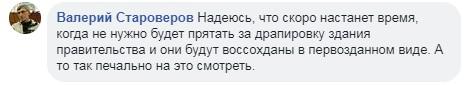 «Надеюсь, что скоро настанет время, когда не нужно будет прятать за драпировку здания правительства, и они будут воссозданы в первозданном виде. А то так печально на это смотреть», - написал 28 сентября Валерий Староверов под видео о репетиции парада в группе «Абаза (Апсуа)- Адыгский(Черкесский) Мир» в Facebook.