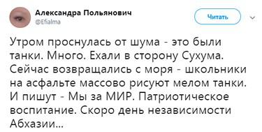 Ко Дню независимости в Абхазии готовились заранее. «Утром проснулась от шума - это были танки. Много. Ехали в сторону Сухума. Сейчас возвращались с моря - школьники на асфальте массово рисуют мелом танки. И пишут – «Мы за МИР». Патриотическое воспитание. Скоро день независимости Абхазии», - написала Александра Польянович 28 сентября на своей странице в «Твиттере».