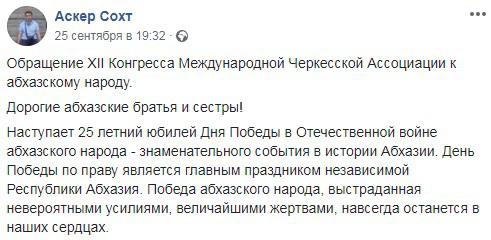 Зампредседателя "Адыгэ Хасэ" Краснодарского края Аскер Сохт выложил на своей странице в Facebook обращение XII Конгресса Международной Черкесской Ассоциации к абхазскому народу по случаю Дня независимости. «В этот день мы вспоминаем лучших сынов Абхазии и добровольческое движение Северного Кавказа, многих иных регионов России и зарубежья, вставших на защиту Абхазии. Многие из них отдали самое ценное - свои жизни ради мира на абхазской земле, процветания нынешнего и будущих поколений народа Абхазии», - говорится в обращении.