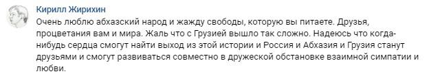 «Очень люблю абхазский народ и жажду свободы, которую вы питаете. Друзья, процветания вам и мира. Жаль, что с Грузией вышло так сложно. Надеюсь, что когда-нибудь сердца смогут найти выход из этой истории, и Россия, и Абхазия, и Грузия станут друзьями и смогут развиваться совместно в дружеской обстановке взаимной симпатии и любви», - написал сегодня Кирилл Жирихин под постом в сообществе «Аҧсны Аҳәынҭқарра | Абхазия» соцсети «ВКонтакте».
