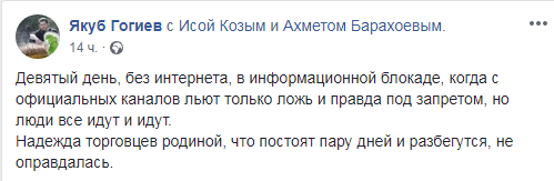 "Девятый день, без интернета, в информационной блокаде, когда с официальных каналов льют только ложь и правда под запретом, но люди все идут и идут", - написал 13 октября в 19.43 мск на своей странице в соцсети Facebook Якуб Гогиев.