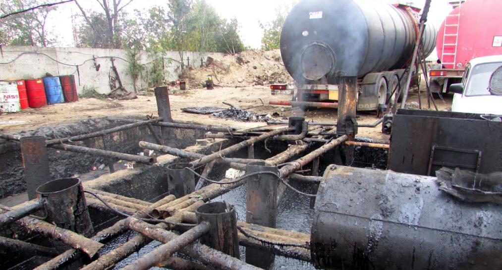 Неподалеку от этого склада обнаружен объект по переработке нефтепродуктов, который представляет собой котлован, в котором кипит "нефтяная каша". У котлована стоял автомобиль с автоцистерной, который готовился к загрузке жидких нефтепродуктов из котлована. Сторож этого объекта и водитель автоцистерны отказались представиться и сообщить о деятельности объекта.