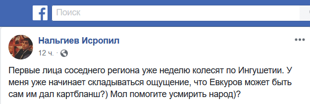 "Первые лица соседнего региона уже неделю колесят по Ингушетии. У меня уже начинает складываться ощущение, что Евкуров, может быть, сам им дал карт-бланш?", - написал сегодня активист Исропил Нальгиев на своей странице в Facebook.
