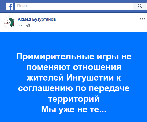 Сходное мнение выразил активист Ахмед Бузуртанов. "Примирительные игры не поменяют отношения жителей Ингушетии к соглашению по передаче территорий. Мы уже не те..." - написал он в Facebook.