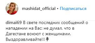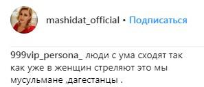 Пользователи соцсетей выразили недоумение по поводу этого преступления. "Люди с ума сходят, так как уже в женщин стреляют, это мы, мусульмане, дагестанцы", - написал пользователь под ником 999vip_persona_ в комментарии к последнему сообщению о певице на ее странице в Instagram.