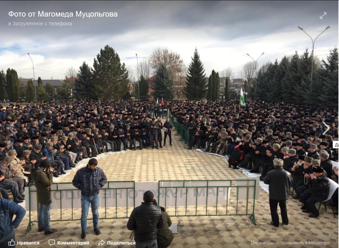 "Назрань. Народный митинг протеста начался!" - написал сегодня руководитель правозащитной организации "МАШР" Магомед Муцольгов в своем аккаунте в Facebook, опубликовав фото с акции.