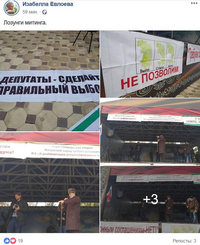 На месте митинга размещены растяжки с лозунгами: "Депутаты - сделайте правильный выбор!", "Не позволим!", "Ингушский народ требует чтить Конституцию Республики! Уважайте народы России! Уважайте нашу Конституцию! Уважайте ингушский народ!", отмечается в сегодняшнем сообщении на странице журналистки Изабеллы Евлоевой в соцсети Facebook, где размещены фотографии лозунгов.