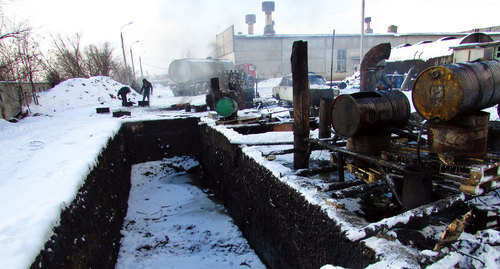 Арендатор линии по переплавке нефтеотходов показал корреспонденту "Кавказского узла" склад временного хранения нефтепродуктов.