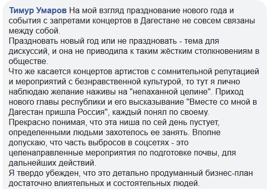"Праздновать Новый год или не праздновать - тема для дискуссий, и она не приводила к таким жестким столкновениям в обществе. Что же касается концертов артистов с сомнительной репутацией и мероприятий с безнравственной культурой, то тут я лично наблюдаю желание наживы на "непаханой целине". Приход нового главы республики каждый понял по-своему. Прекрасно понимая, что эта ниша по сей день пустует, определенными людьми захотелось ее занять. Я твердо убежден, что это детально продуманный бизнес-план достаточно влиятельных и состоятельных людей. И раньше были разные попытки, но они были редкими и не создавали такого общественного резонанса. Тут за короткий промежуток времени одно событие за другим", - заявил Умаров.
