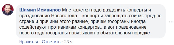 Стоит разделять празднование Нового года и запрет различных концертов, считает пользователь Facebook Шамил Исмаилов.
