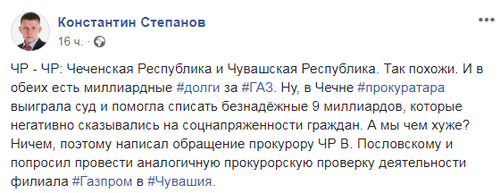 С просьбой простить задолженность за газ жителям Чуваши в прокуратуру также обратился депутат Государственного совета Чувашской Республики Константин Степанов. "Чеченская Республика и Чувашская Республика. Так похожи. И в обеих есть миллиардные долги за газ. Ну, в Чечне прокуратура выиграла суд и помогла списать безнадёжные 9 миллиардов, которые негативно сказывались на соцнапряженности граждан. А мы чем хуже? Ничем, поэтому написал обращение прокурору ЧР В. Пословскому и попросил провести аналогичную прокурорскую проверку деятельности филиала", - написал он на своей странице в Facebook.