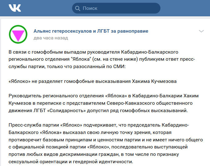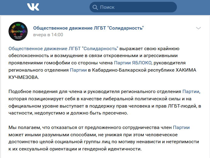 "Руководитель регионального отделения «Яблока» в Кабардино-Балкарии Хаким Кучмезов в переписке с представителем Северо-Кавказского общественного движения ЛГБТ «Солидарность» допустил ряд гомофобных высказываний. Пресс-служба партии «Яблоко» подчеркивает, что председатель Кабардино-Балкарского «Яблока» высказал свою личную точку зрения, которая противоречит базовым принципам и ценностям партии и не имеет ничего общего с официальной позицией партии «Яблоко», последовательно выступающей против любых видов дискриминации граждан, в том числе по признаку сексуальной ориентации и гендерной идентичности", - приводит заявление политической силы "Альянс гетеросексуалов и ЛГБТ за равноправие" в Facebook.
