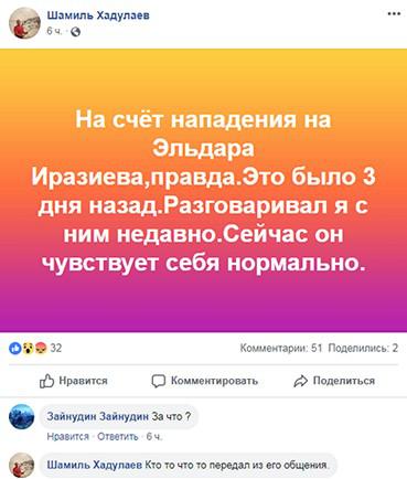 "24 января на Эльдара Иразиева было совершено нападение. Пострадавший не стал обращаться с заявлением в отдел полиции", - рассказал источник, слова которого приводит «АиФ Дагестан».