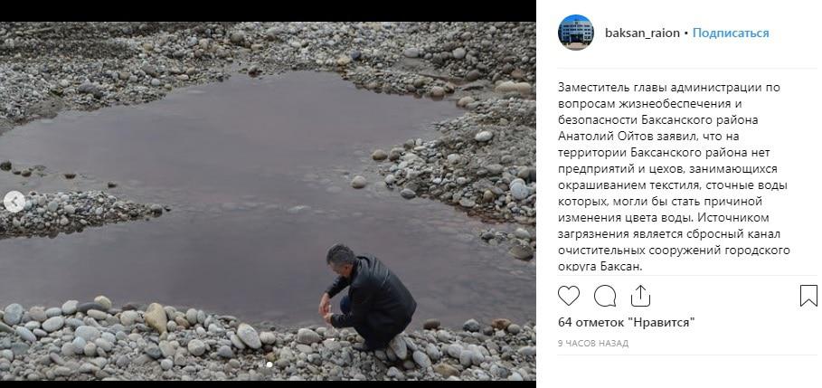 В администрации отметили, что "на территории Баксанского района нет предприятий и цехов, занимающихся окрашиванием текстиля, сточные воды которых могли бы стать причиной изменения цвета воды".