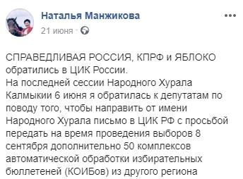Отметим, что 21 июня у себя на странице в соцсети Facebook Манжикова сообщила, что реготделения "Справедливой России" и "Яблока" попросили ЦИК передать республике из другого региона дополнительно 50 комплексов автоматической обработки избирательных бюллетеней (КОИБов) "для предотвращения массовых фальсификаций на предстоящих выборах" 8 сентября.