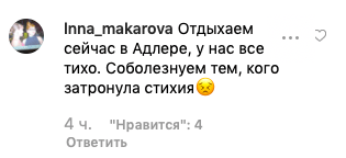 "Отдыхаем сейчас в Адлере, у нас все тихо. Соболезнуем тем, кого затронула стихия", - написала lnna_makarova.