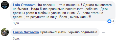 "Что посеешь, то и пожнёшь! Одного виноватого не бывает. Надо было правильно воспитывать ребёнка. Дети должны расти в любви и уважении к ним. А если этого не делать, то результат налицо. Всех очень жаль!" – написала, в частности, Lala Ortanova. "Правильно! Дети - зеркало родителей!" – согласилась Larisa Nazarova.