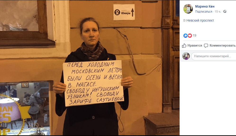 Пикет в поддержку арестованных участников мартовских акций протеста в Магасе провела 27 сентября в Санкт-Петербурге местная активистка Марина Кен. Она стояла с плакатами, на которых был призыв освободить ингушских активистов, в том числе Малсага Ужахова, Ахмеда Барахоева и Зарифу Саутиеву.