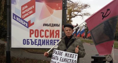 Никакого единства нет и быть не может, считает Владимир Васильченко. "Ложь – это телевидение, ложь – что нам нельзя пикетировать, в частности, наш мэр запрещает пикетирование (власти Волгограда регулярно отказывают активистам "Стратегии-31" в согласовании митингов в центре города, поэтому их акции проходят в формате одиночных пикетов, последняя такая акция прошла 31 октября – прим. "Кавказского узла"). Но меня радует, что еще год назад меня за этот плакат наверняка потащили бы в полицию, а сейчас - нет. Ко мне трижды подходили полицейские, они были очень доброжелательные и не скрывали своей поддержки", - заявил корреспонденту "Кавказского узла" Владимир Васильченко.