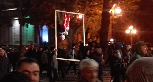 Группа активистов принесла на митинг у парламента чучело Бидзины Иванишвили, повешенное вверх ногами. Протестующие стоят перед парламентом, занимая площадь от кинотеатра "Руставели" до церкви Святого Георгия (Кашетской церкви). Полиция обеспечивает порядок, стычек между силовиками и протестующими во время шествия и митинга не было.
