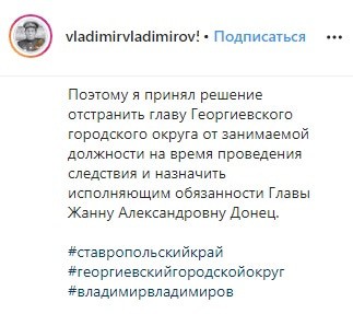 "Принял решение отстранить главу Георгиевского городского округа от занимаемой должности на время проведения следствия и назначить исполняющим обязанности главы Жанну Александровну Донец", - написал 13 февраля Владимир Владимиров на своей странице в Instagram.