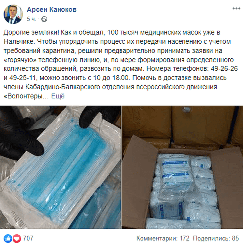 "100 тысяч медицинских масок уже в Нальчике. Чтобы упорядочить процесс их передачи населению с учетом требований карантина, решили предварительно принимать заявки на «горячую» телефонную линию, и, по мере формирования определенного количества обращений, развозить по домам", - написал он 8 апреля на своей странице в Facebook, насчитывающей 9 603 подписчика.