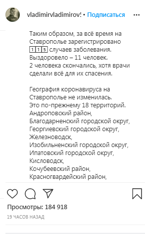 К 15 апреля на Ставрополье зарегистрировано 115 случаев заражения коронавирусом, излечились 11 человек, написал Владимиров на своей странице в Instagram.