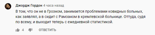 "Он не в Грозном занимается проблемами ковидных больных, как заявлял, а сидит с Рамзаном в кремлевской больнице. Оттуда, судя по всему, и выходит теперь с ежедневной статистикой", - предположил в комментарии к видео пользователь Джордж Гордон.