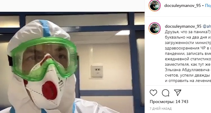 На видео, размещенных на официальной странице ЧГТРК в Instagram, насчитывающей 819 тысяч подписчиков, Сулейманов озвучивает статистику о заболеваемости коронавирусом на 24 и 25 мая в обычном больничном халате на фоне белой стены.