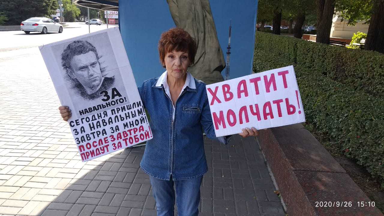 "Это позор на весь мир, что Навального отравили ядом, который используется в военных целях. Сколько уже людей умерло загадочной смертью. Тем не менее, российские власти отпираются и придумывают одну версию глупее другой - что чуть ли не в Германии его отравили. Я не пишу на плакате, о ком идет речь, чтобы ко мне полиция не привязывалась. Ни в какой стране отравитель не может быть президентом. Нас поодиночке убивают и судят, а люди молчат. Если бы вышли, как в Беларуси или в Хабаровске, не было бы и отравлений", - сказала Галина Тихенко корреспонденту "Кавказского узла".
