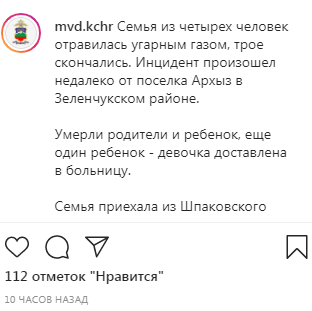 Семья из четырех человек приехала в Карачаево-Черкесию из Шпаковского района Ставропольского края и осталась ночевать в доме на колёсах, сообщило 3 октября МВД по Карачаево-Черкесии на своей странице в Instagram. Во сне от отравления угарным газом умерли родители и ребенок, говорится в сообщении.
