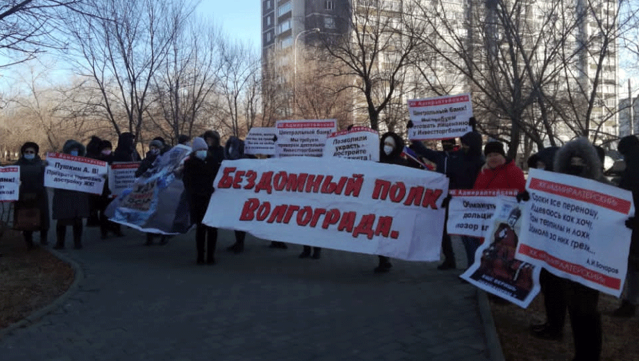 Акции протеста дольщики ЖК "Адмиралтейский" проводили неоднократно. В июле они угрожали властям голодовкой. Два недостроенных 20-этажных дома этого жилищного комплекса в Красноармейском районе должны были сдать еще в 2015 году. Против застройщика возбуждено уголовное дело. В Арбитражном суде Волгоградской области рассматривается заявление "Инвестторгбанка", который кредитовал застройщика и теперь пытается вернуть вложенные средства. Дольщики опасаются, что кредитор может отобрать их квартиры в недостроенных домах.